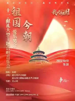 “我和我的祖国”·“祖国·今朝”——爱乐男合十一·献礼大型主题合唱音乐会 时间:2023.10.01 周日 19:30 场馆:北京音乐厅 票价:99/199/299/399 微信订票:18515362586 订票电话:400-600-4100