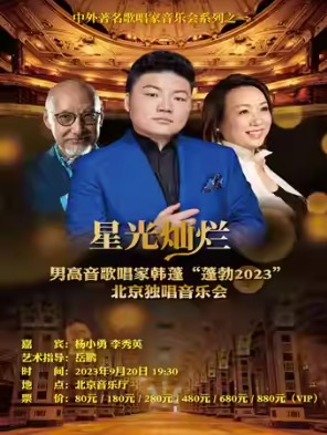 星光灿烂--著名男高音歌唱家韩蓬 “蓬勃2023”北京独唱音乐会 时间:2023.09.20 周三 19:30 场馆:北京音乐厅 票价:80/180/280/480/680/880 微信订票:18515362586 订票电话:400-600-4100